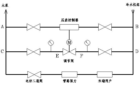 如上圖所示,作用在調(diào)節(jié)閥上的壓差值就是E和F之間的壓差值,由于C-D旁通管路與經(jīng)過末端用戶的D-U-C管路的阻力相當(dāng),所以E-F之間的壓差值應(yīng)等于D-U-C管路壓差(指末端用戶最不利環(huán)路壓差)減去C-E管段和F-D管段的壓差值。