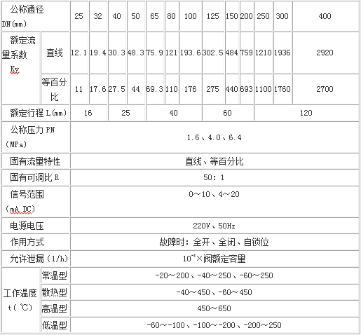 下表為上海恒星泵閥制造有限公司的ZDLN型電子式電動直通雙座調(diào)節(jié)閥的技術(shù)參數(shù)表,由公式(2)算得C=100.6,該調(diào)節(jié)閥的固有流量特性為直線型和等百分比特性,按照等百分比特性選擇最接近的C值,得到管徑為DN80,C值為110,符合選型要求。